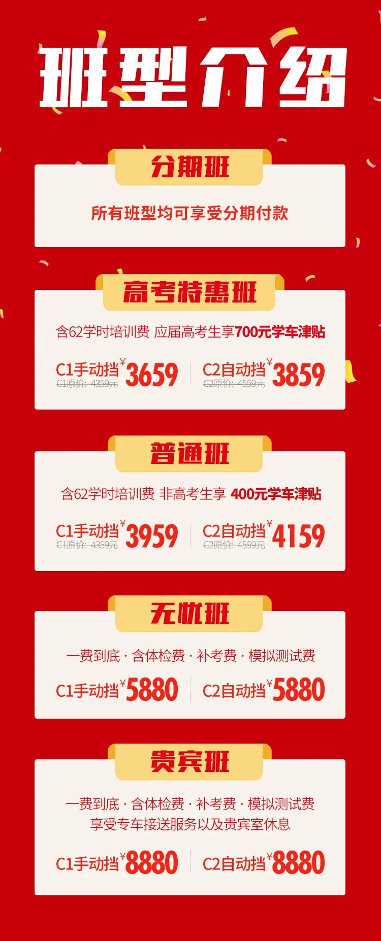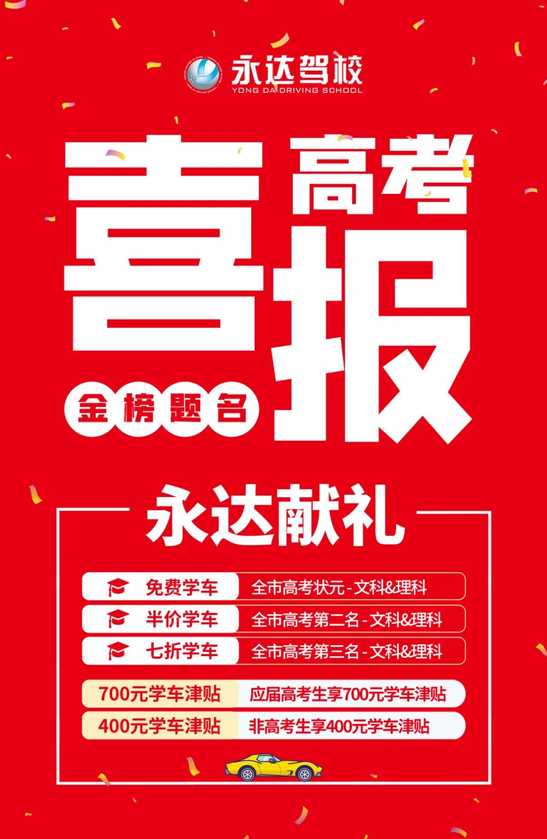 旗开得胜,金榜题名。 高考加油 有一场青春叫高考, 你的努力终将成就不可替代的自己, 所有考生都是英雄,十二年寒窗苦读, 只为一朝金榜题名,最棒的夏天, 送给最强的你。 【考试时间】2020年7月7日 【考试科目】语文、数学 【考试时间】2020年7月8日 【考试科目】文综/理综,外语 永达献礼 暑期狂欢季,永达送福利啦! 为奖励所有高考学生的辛勤努力, 驾校准备了丰厚礼品, 请各位考生速来领取! 全市高考状元文科&理科: 回馈全城 再次祝各位学子高考顺利 实现心中的大学梦 自有科目二科目三双考场 本校直考 AAA级驾校 非挂靠 全直营 诚信收费 品质教学 优质服务