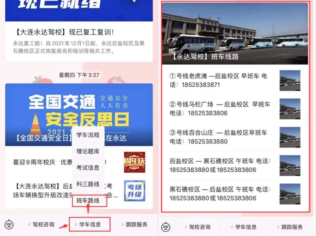 预约及乘坐摆渡车注意事项: 1. 提前与您的教练员联系。 2. 必须携带好本人身份证和学员证,乘车期间请保持车内卫生,车内禁止吸烟。 3. 严格遵守乘车时间,如错过乘车时间请自行解决。 4. 疫情期间请学员主动出示“通信行程码”ˎ“辽事通”健康码及学员证并配合教练做好体温测试登记工作。 5. 如预约乘车时间出现改动,请您务必第一时间与您的教练员联系。 专属摆渡车监督电话:0411-86755066 班车路线微信平台查询方式: 1. 打开微信公众号,在搜索小程序一栏中,输入“大连永达驾校” 2. 点击查询点击进入“大连永达驾校”公众号, 点击底部“学车信息”再点击“班车路线”查询。